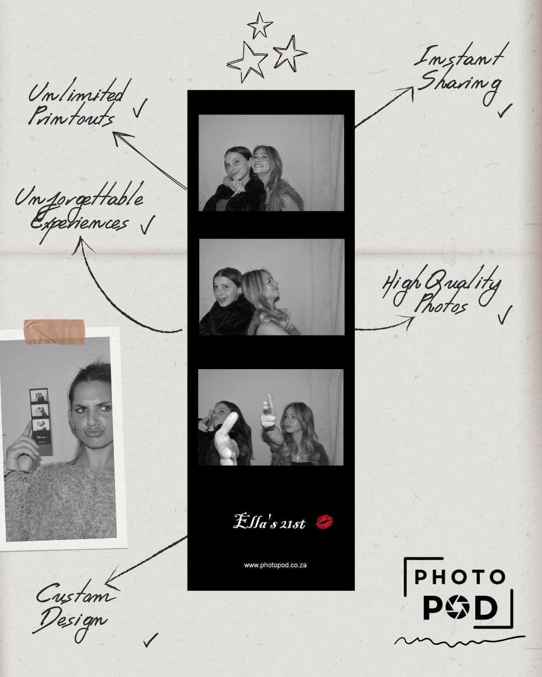 At Photo Pod, we offer a variety of booth options, including closed photo booths for a more traditional experience, open-air setups for larger group shots, and green screen photo booths to place you anywhere in the world. With attention to detail, high-quality prints, and a focus on delivering fun, laughter, and lasting memories, we’re here to turn your event into something truly spectacular.